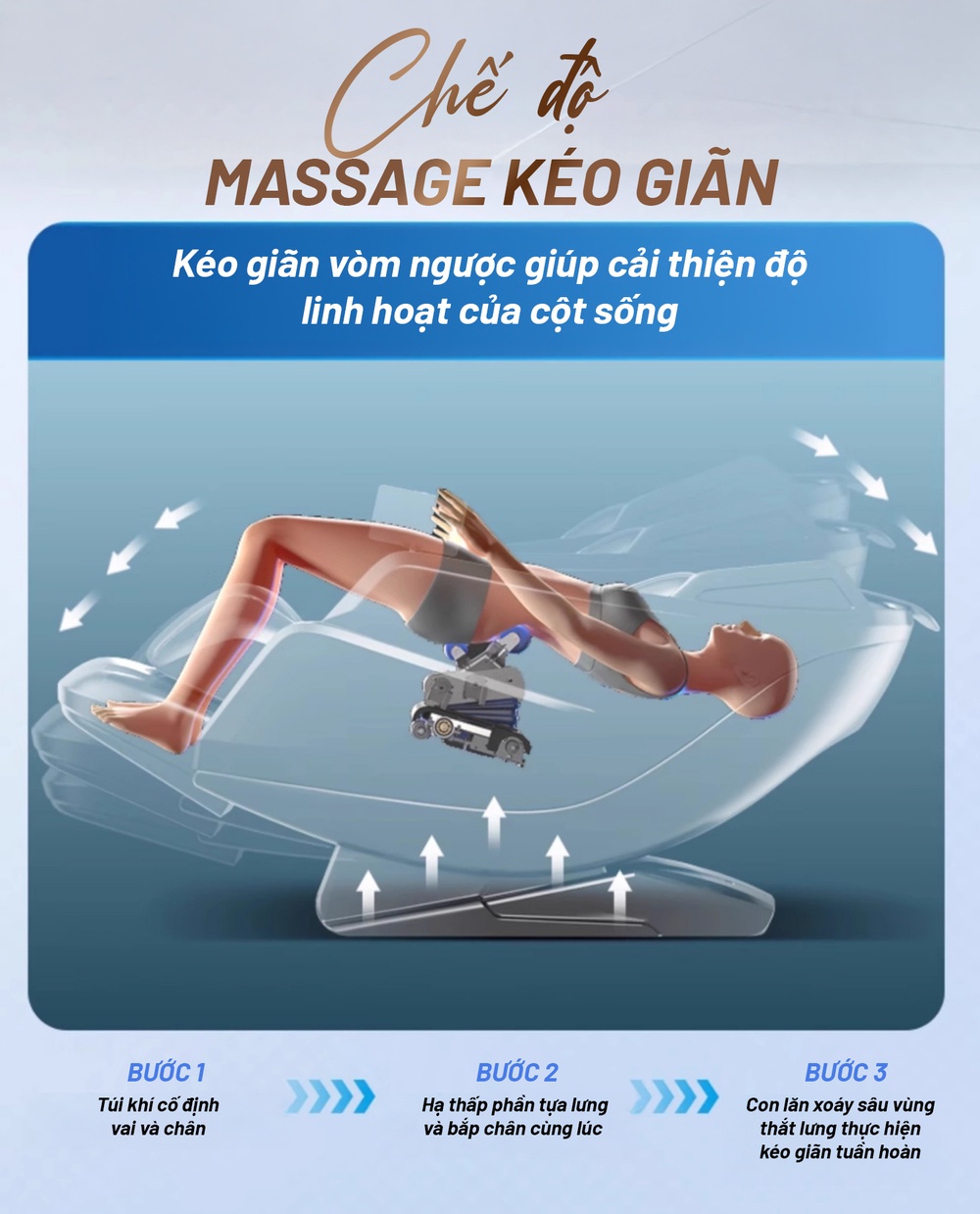 Dành cho những ai hay ngồi sai tư thế hoặc làm văn phòng, chế độ này mô phỏng động tác vươn vai, kéo giãn tự nhiên. Từ đó giúp giải tỏa áp lực vùng ngực và thắt lưng, làm tăng độ dẻo dai cho cột sống.
