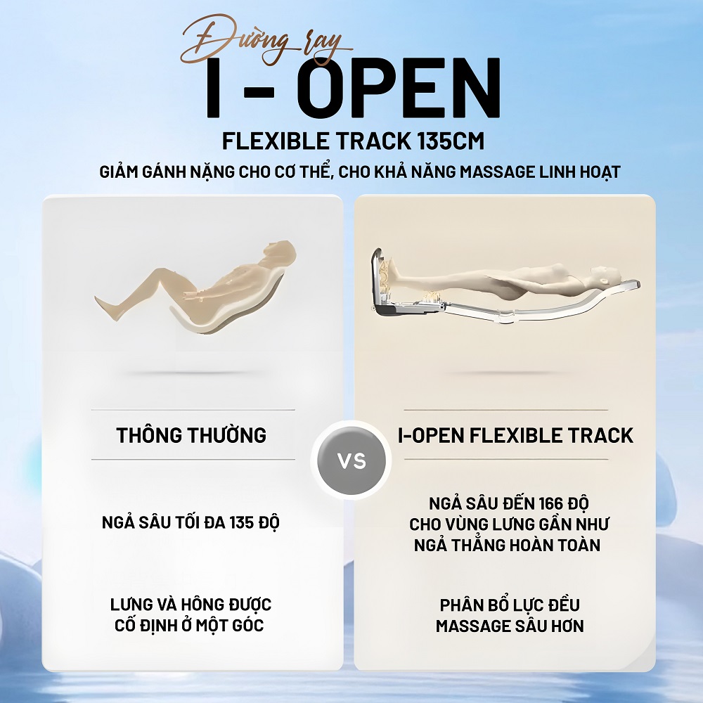 Với thiết kế khung ray dài và linh hoạt, ghế có thể ngả sâu tới 166 độ (gần như nằm thẳng). Con lăn chạy dọc theo đường cong cơ thể từ cổ xuống tận đùi, giúp lực massage phân bổ đều, mang lại trải nghiệm liền mạch và thoải mái hơn so với các loại ghế có đường ray thông thường.